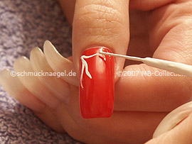 Utilice el nail art liner de color blanco. Empiece en el lado izquierdo de la uña y pinte tres líneas con curva.