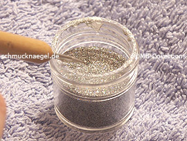 Desparrame ahora el polvo de plata sobre toda la uña. Repita otra vez el paso hasta que tenga la cantidad deseada.
