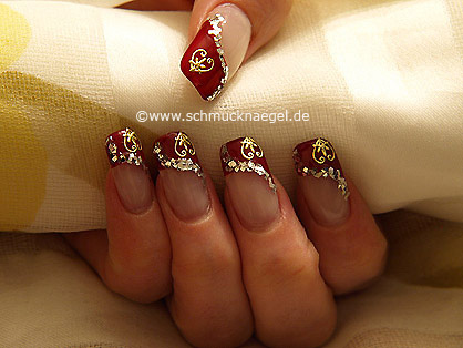 Coja con la pinzeta con cuidado un nail tattoo con forma de corazón, pegué el corazón sobre el color rojo oscuro. Como en la image.