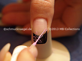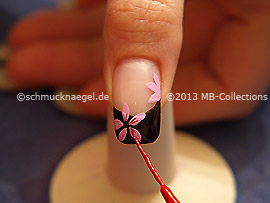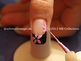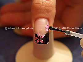 Al principio de la instrucción le recomendamos empezar con el dedo pulgar. Pinte desde la línea amarilla (linea de sonrisa - smile-line) con el esmalte en negro la uña. Antes de continúar espere hasta que el barniz de uñas este seco. Dibuje ahora con el nail art liner (delineador para uñas) en rosa varios pétalos. Espere otra vez hasta que el barniz de uñas este seco. Con el nail art liner (delineador para uñas) de color rojo se dibujan en los pétalos líneas cortitas. Coloque dos gotas del esmalte transparente en el centro de los pétalos. Fijar ahora con ayuda del spot-swirl las piedras strass en cristal. A continuación se dibujan cuatro hojas con el nail art liner de color verde claro. Antes de continúar con el último paso espere hasta que el esmalte este seco. Al fin se pinta toda la uña con una capa de barniz para uñas transparente para proteger el diseño de flores y darle un acabado brillante. En este resumen manual diseño de flores con esmalte y piedras strass le enseñamos sencillamente como hacer este arte lindo y elegante con flores.