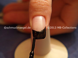 Empiece en el lado izquierdo sobre la línea amarilla (linea de sonrisa – smile-line) y pinte con el esmalte (barniz de uñas) de color negro una línea con curva hasta el borde derecho de la uña.