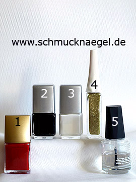 Al principio de la instrucción le recomendamos empezar con el dedo pulgar, el tiene la superficie màs grande para aplicar el diseño cobertura en uñas con nail art liner y esmaltes en diferentes colores. Pinte con el esmalte de color rojo toda la uña. Antes de continúar con el diseño cobertura en uñas con nail art liner y esmaltes espere hasta que el esmalte este seco. Dibuje ahora varias líneas sobre la uña con los esmaltes en negro, blanco y rojo. Espere otra vez hasta que los esmaltes esten secos. Rebordee las líneas con los diferente esmaltes, con el nail art liner (delineador para uñas) en oro-purpurina. Un consejo, para dibujar líneas finas tiene que quitar del pincel la laca que sobre. Antes de finalizar el diseño cobertura en uñas con nail art liner y esmaltes en diferentes colores espere hasta que el color este seco. Al fin se pinta toda la uña con una capa de esmalte transparente para proteger el nail art diseño con nail art liner y esmaltes en diferentes colores y darle un acabado brillante. En este resumen diseño cobertura en uñas con nail art liner y esmaltes en diferentes colores le enseñamos sencillamente decorar las uñas y hacer esta obra de arte hermosa con diseños creativos y bonitos para fiestas o cualquier otra ocasión.
