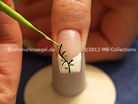 Pinte con el nail art liner en verde claro varias hojitas sobre la línea negra.