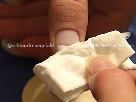 Humedezca ahora con el líquido limpiador (Cleaner) un pad para manicura y limpie el residuo pegajoso.