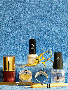 Ponga ahora los nail art bouillons con cuidado en una fila en el esmalte transparente húmedo, como en las fotografías demostrado.