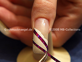 Para la preparación corte un pedazo de la cinta adhesiva, sujete la cinta adhesiva con la pinzeta. Pegué ahora el pedazo de la cinta adhesiva diagonal en la uña.