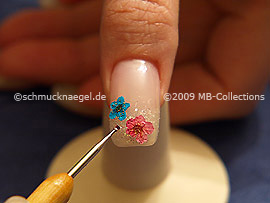 Coja con la pinzeta una flor seca. Coloque la flor en la gota del esmalte transparente húmedo.
