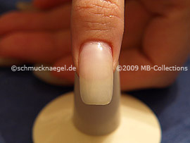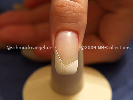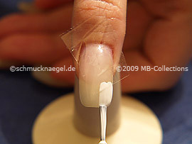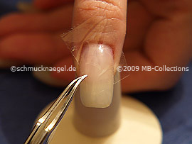 Para la preparación corte un pedazo de la cinta adhesiva transparente. Sujete la cinta adhesiva con la pinzeta. Pegué ahora el pedazo en la uña.