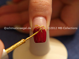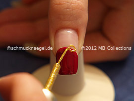 Dibuje con el nail art liner de color oro-glitter un lazo en la transición del esmalte y la superficie libre de la uña.