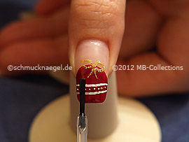 Pinte ahora con el esmalte transparente una línea, entre las dos líneas blancas, para fijar las perlitas para uñas en oro.