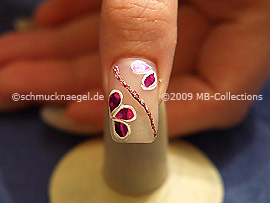 Para la preparación corte cinco pedazos con forma de gota del holograma, sujete un pedazo con la pinzeta y quite el papel de la superficie adhesiva. Pegué ahora la gota adhesiva en el lado izquierdo de abajo sobre la uña.