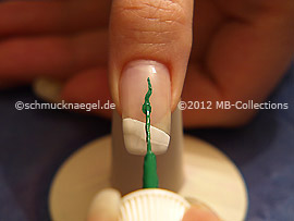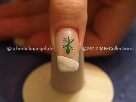 Pinte con el esmalte de color blanco una línea diagonal desde el borde izquierdo hacia el lado derecho de la uña. A continuación se dibuja la superficie delantera. Después más adelante se dibuja la cabeza, el cuerpo, las patitas y los dedos de la salamanquesa con los nail art liner en verde.