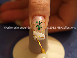 Dibuje ahora con el nail art liner de color oro-glitter varias líneas con curva en la uña para adornar el motivo.