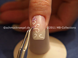 Coja con la pinzeta con cuidado la pegatina tridimensional de flor, pegué la flor sobre la uña.