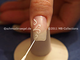 Dibuje con el nail art liner en blanco, varias líneas con curva sobre la uña.