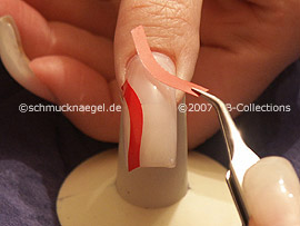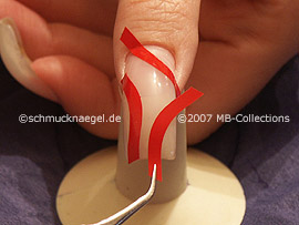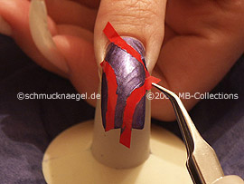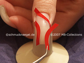 Utilice la pinzeta para coger otra plantilla para manicura francesa. Pegué la plantilla en el lado derecho en la uña.