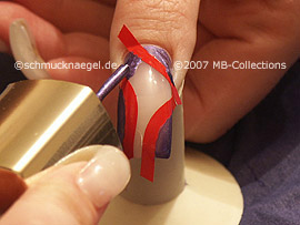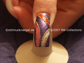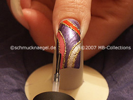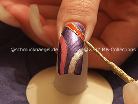 Utilice el nail art liner de color oro-glitter. Dibuje en las transiciónes de los esmaltes una línea en oro-glitter.